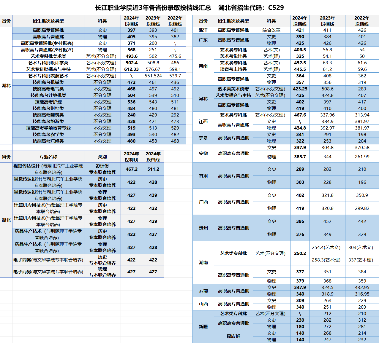 长江职业学院近3年各省份录取投档线汇总(2022年-2024年)